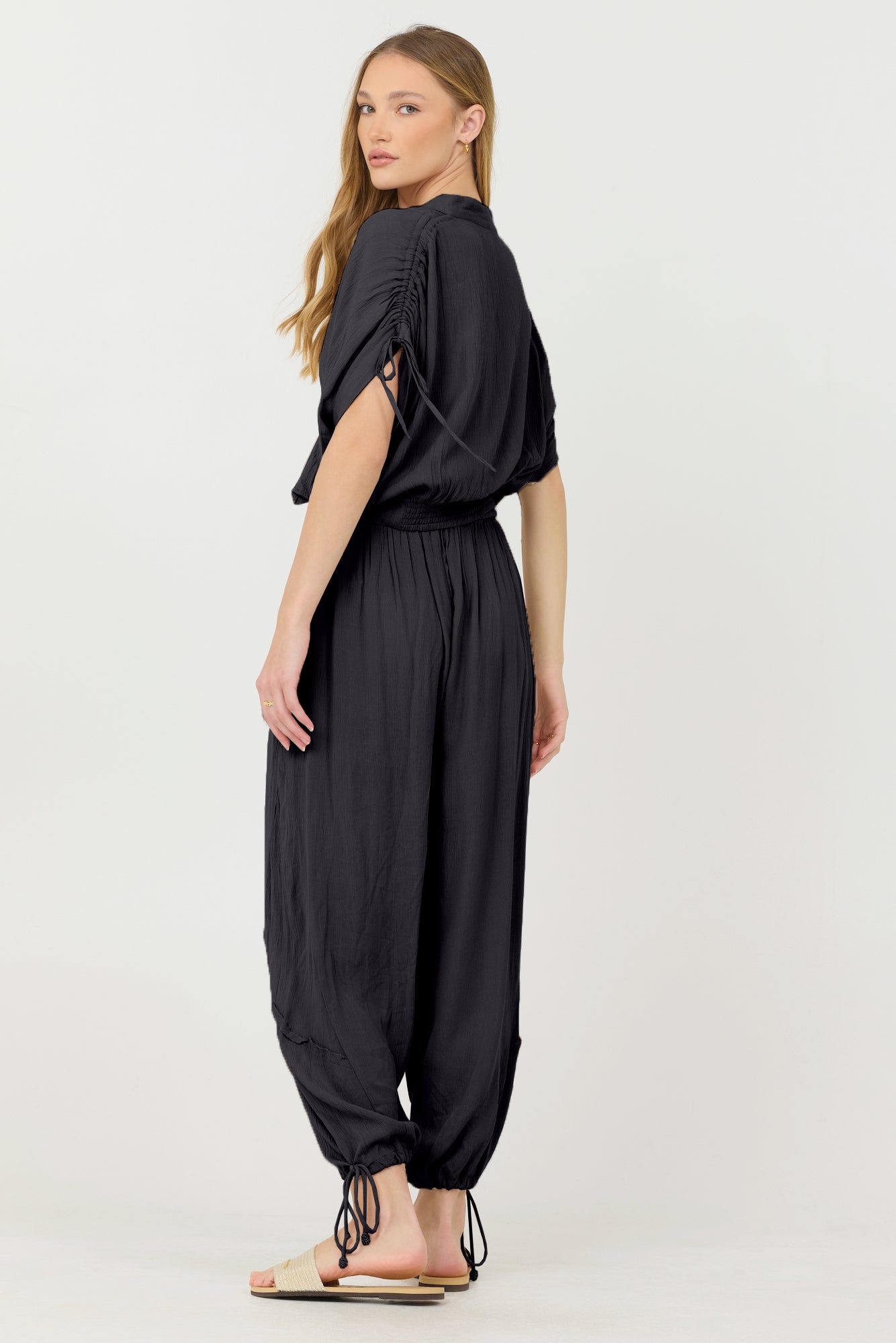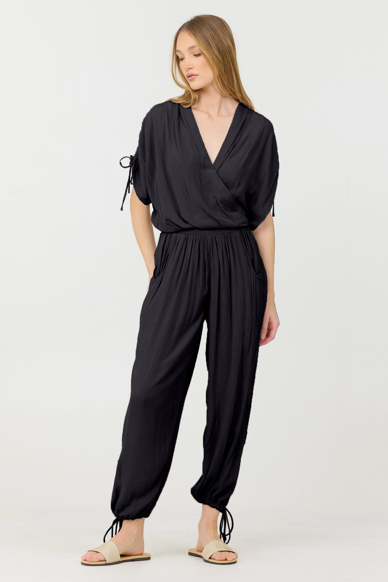 These Black Rayon Crinkle Bottom Pants combine comfort and style with a soft, breathable fabric and a relaxed fit. The elastic waistband ensures a secure yet flexible fit, while the pockets add practical convenience. Finished with adjustable tie hems, these pants offer a customizable look perfect for casual or polished outfits.