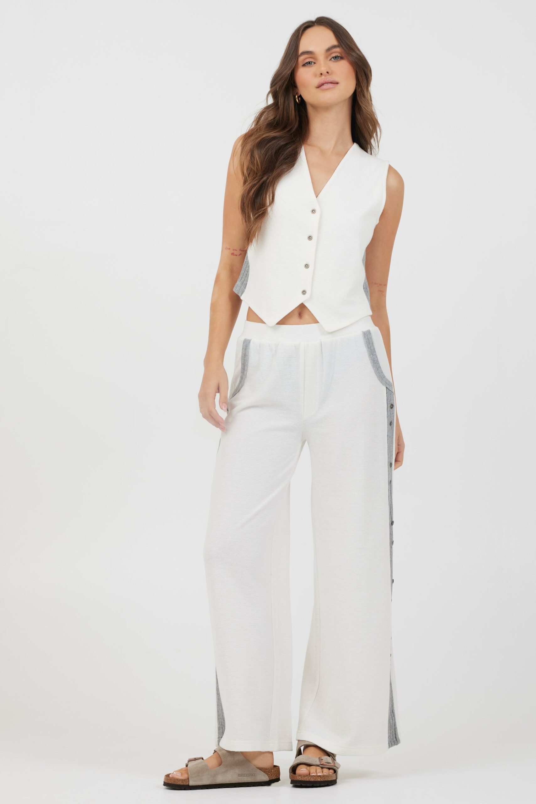 These Cream Heather Grey Texture Knit Pants combine comfort and style with an elastic waistband for a perfect fit and a wide-leg design that offers ease of movement. The button side detailing adds a subtle, sophisticated touch, making them ideal for both relaxed and polished looks.