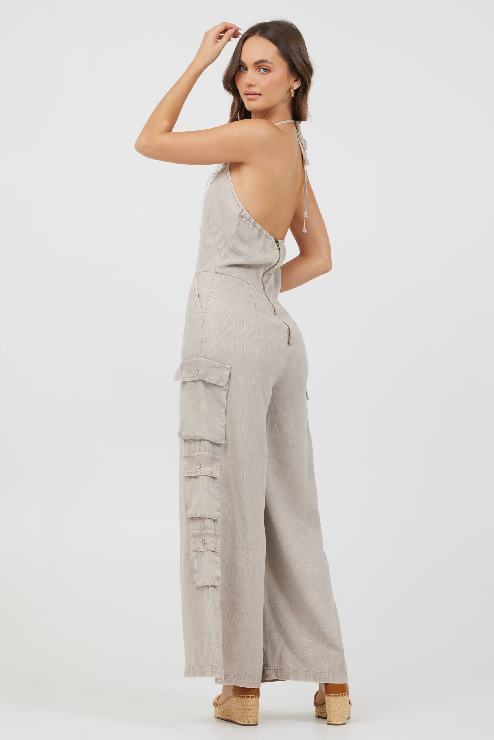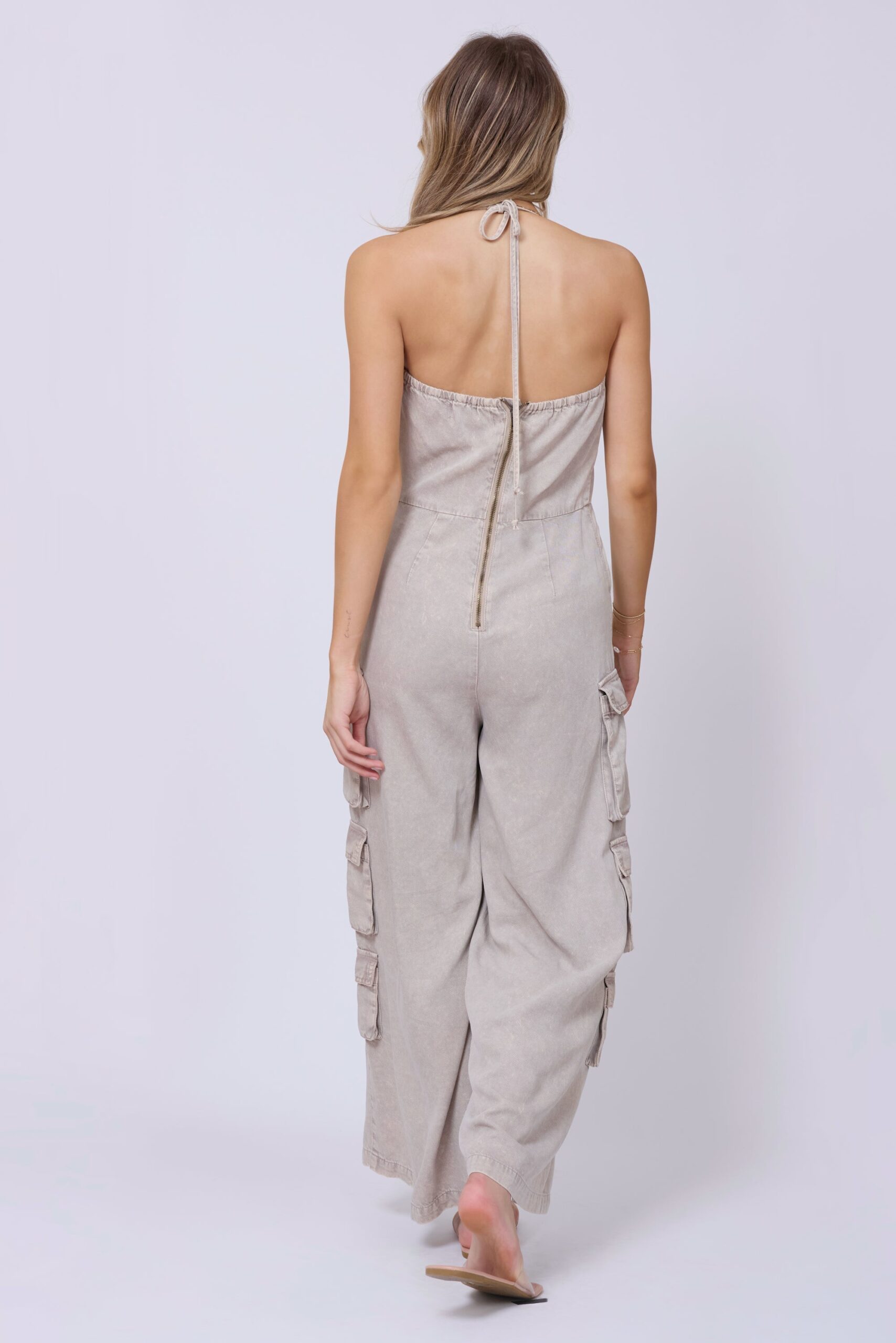 The Khaki Tencel Jumpsuit combines effortless style with comfort. Crafted from 100% lyocell, it offers a soft, breathable feel perfect for all-day wear. Its halter neckline and wide-leg silhouette create a flattering, modern look, while practical cargo pockets add functional detail. Easy to care for, this jumpsuit is machine washable in cold water, making it a versatile addition to your wardrobe.