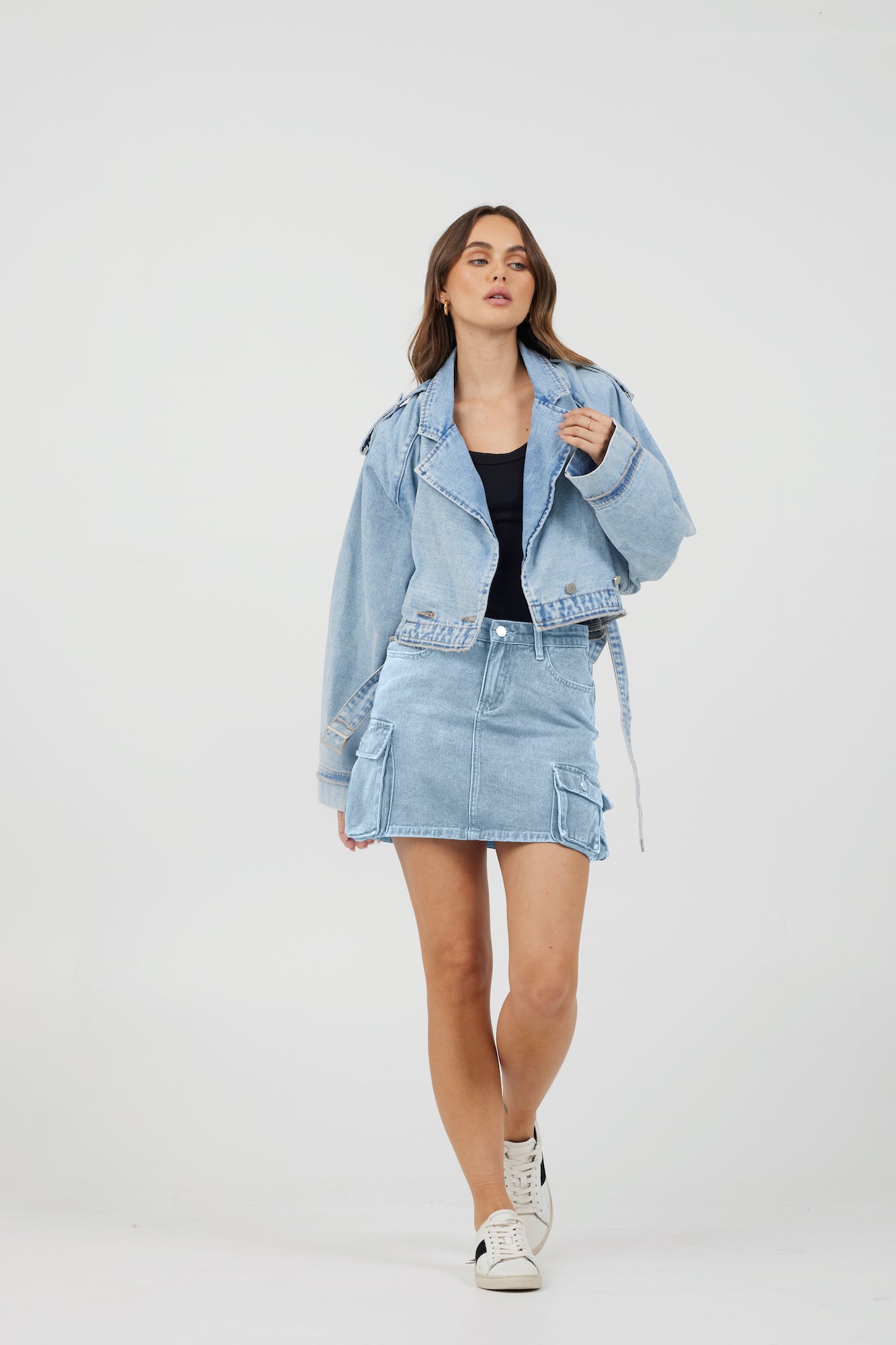 The Light Wash Denim Cargo Skirt combines practical design with casual style. Featuring a convenient zipper fly and multiple pockets—including cargo, front, and back pockets—it offers both functionality and a laid-back look. Perfect for everyday wear, this skirt balances comfort and utility with a classic denim finish.