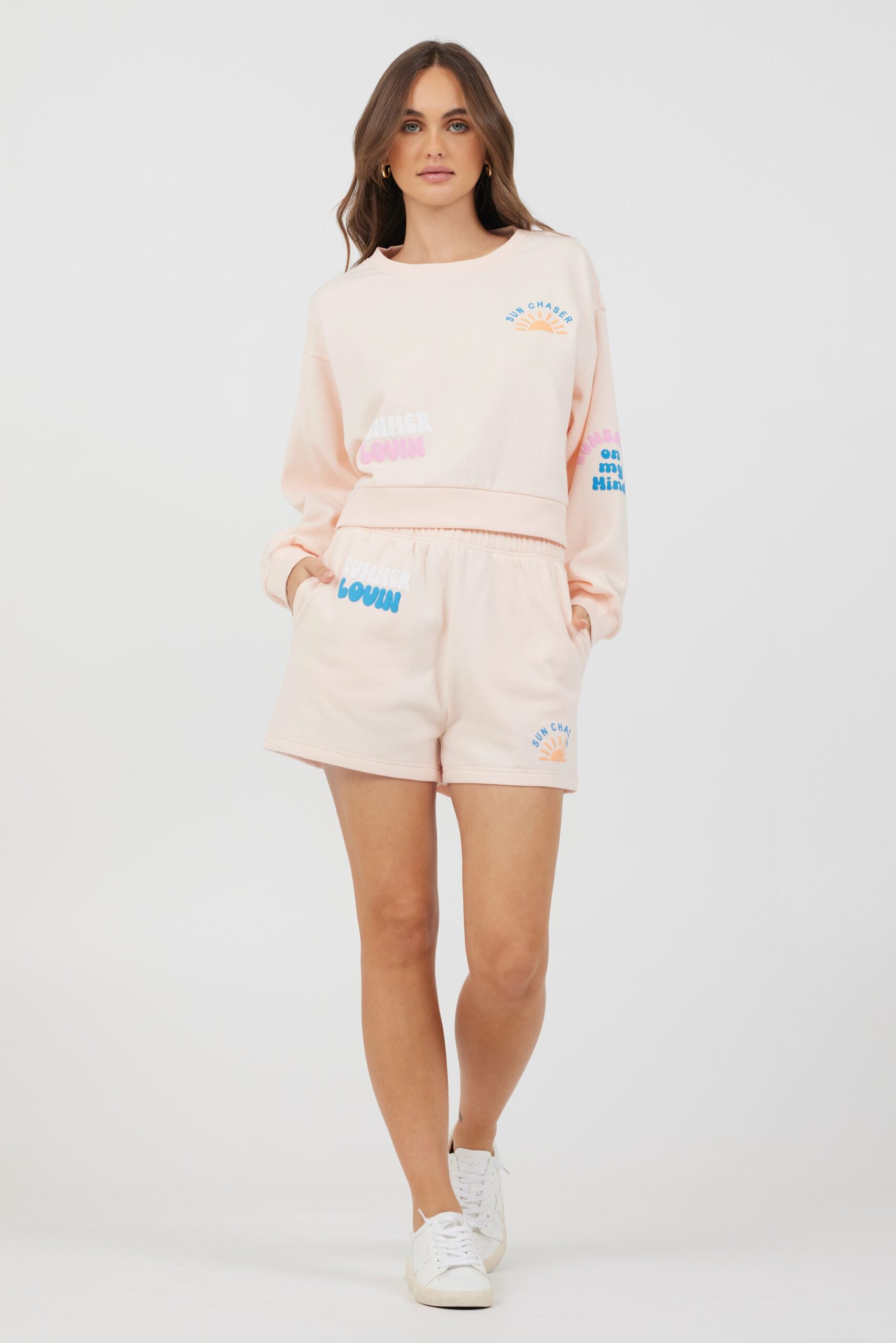 The Peach Parfait W/ Multi Puff Print Surf Wash Crewneck features: