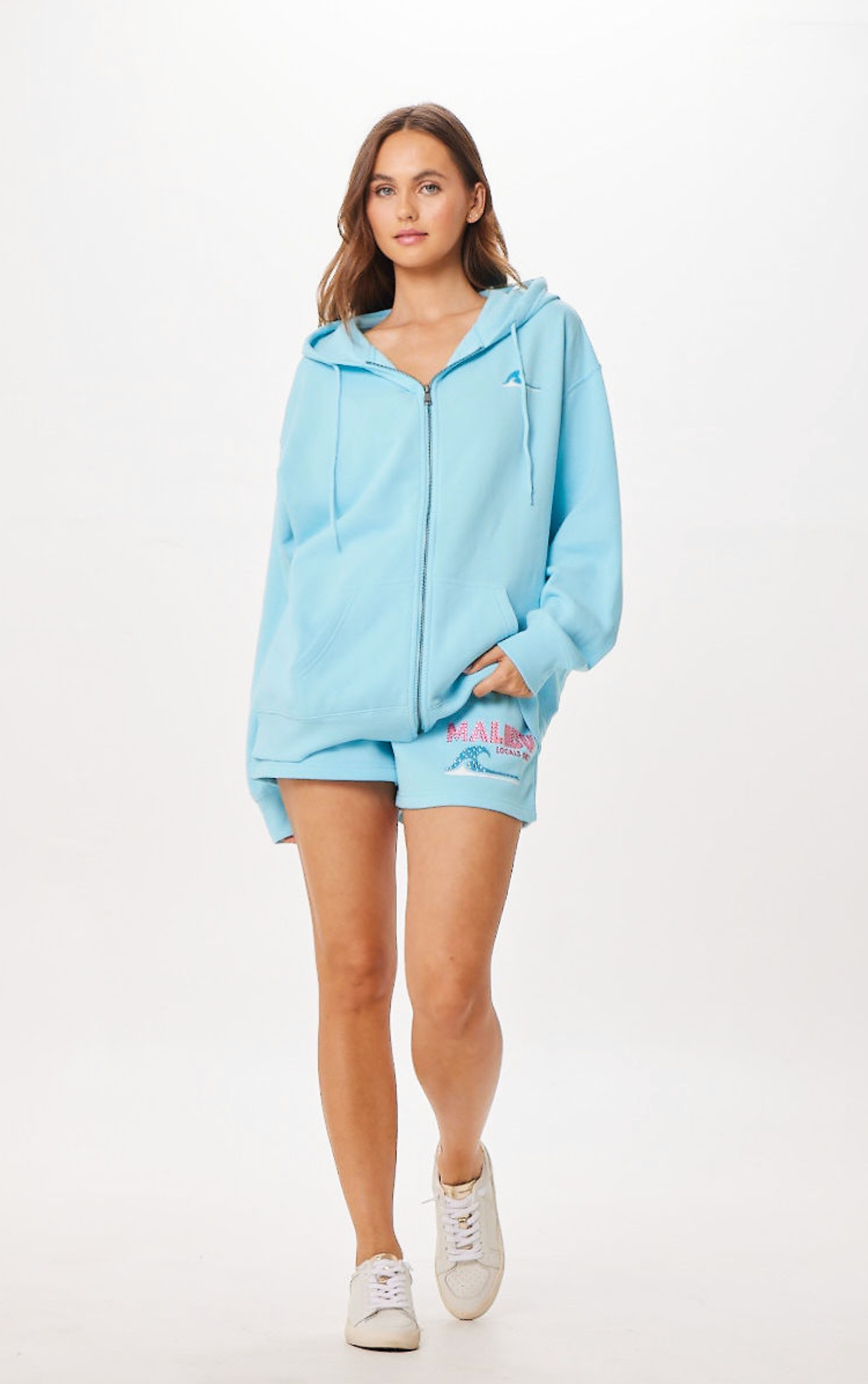 The Tropical Blue Malibu Jet Setter Surf Wash Zip Up combines casual comfort with stylish details. This zip-up sweatshirt features a distinctive “Malibu Locals Only” graphic, adding a touch of coastal authenticity. Enhanced with subtle gem accents, it offers a unique, refined look perfect for everyday wear or relaxed outings.