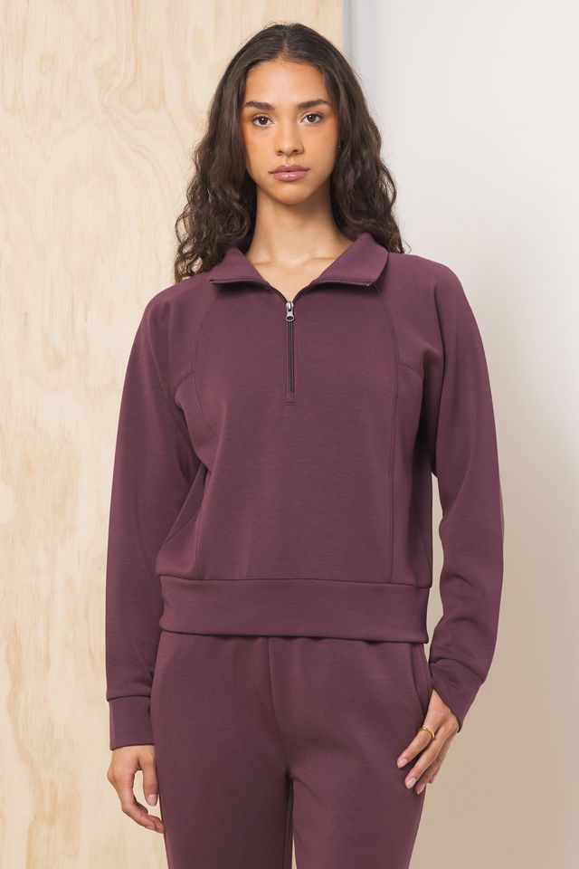 The Truffle Cloud Fleece 2-Piece Set combines comfort and style with its soft fleece fabric and practical quarter-zip design. Paired with a flare pant.